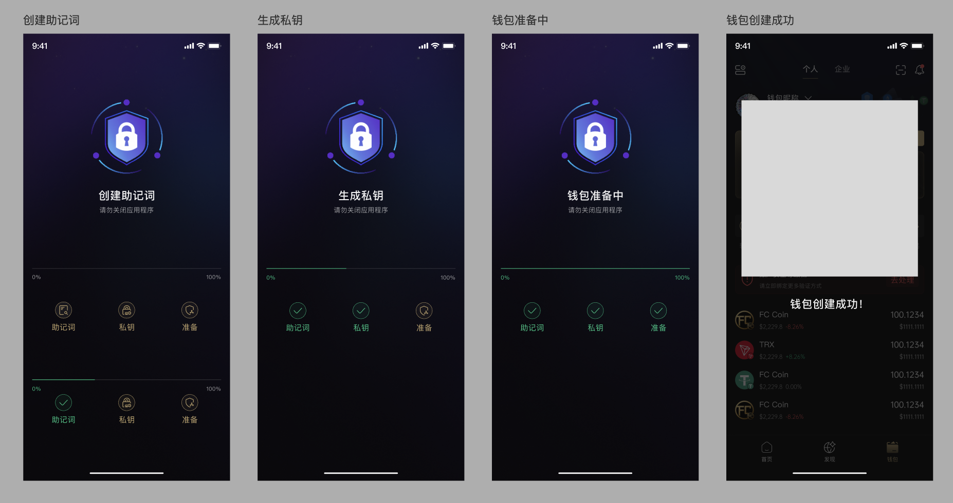 - 全部都完成后,进入到钱包首页,要弹个创建成功的弹窗,或者弹个toast(不要用系统的toast,要用我们的设计的toast,UI设计以下)