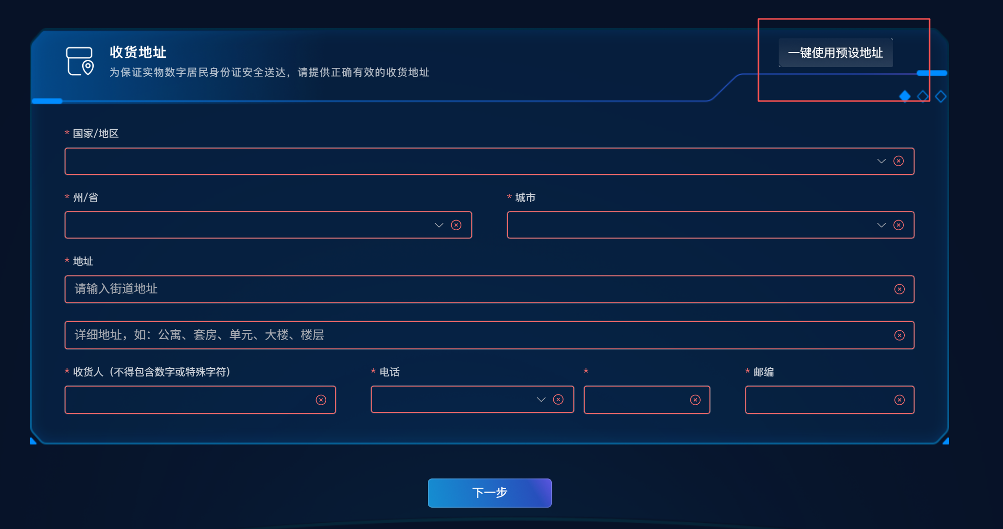 3、在审核处填写收货地址时,点击了预设地址按钮后,又修改了某项信息,按钮又会变亮
